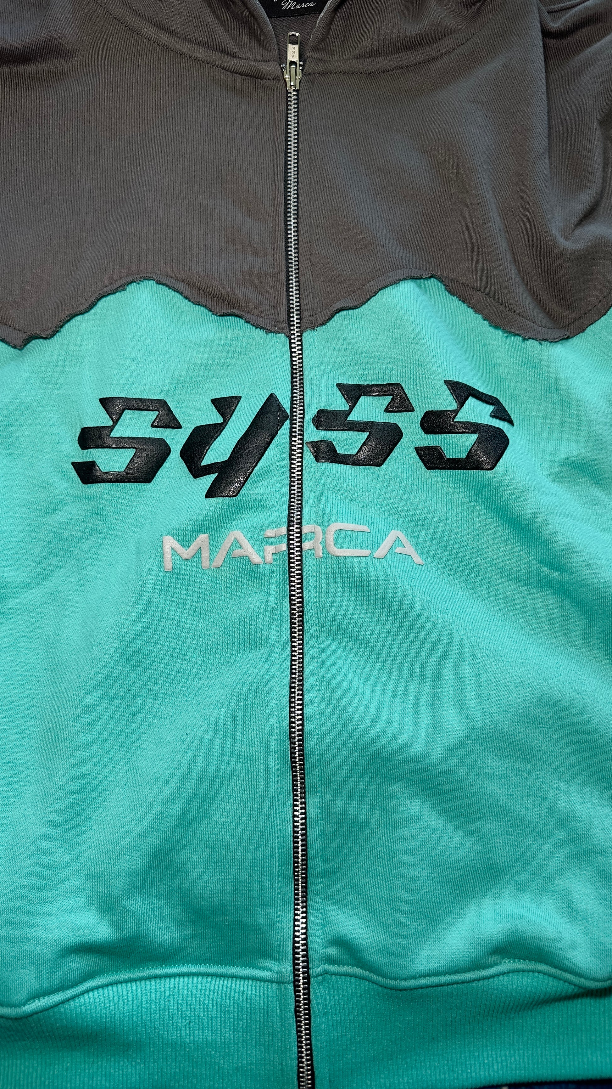 This heavyweight hoodie is a blend of cotton and French terry. Hand cut with puff print on all the logos. Zippers are on both side pockets.